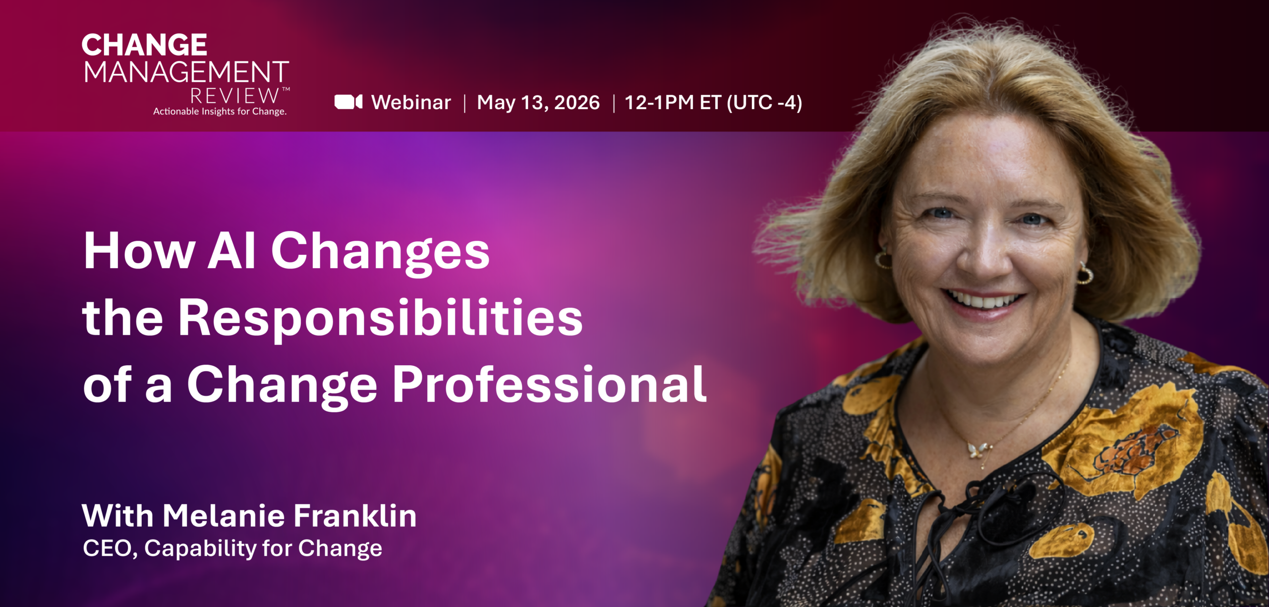 This webinar is brought to you by Change Management Review™ in collaboration with Melanie Franklin, who helped shape its content and supports its delivery. As AI continues to transform the way organizations operate, Change Management Review™ remains committed to providing relevant, forward-looking learning experiences that equip professionals with the insights and capabilities needed to thrive in an evolving landscape.