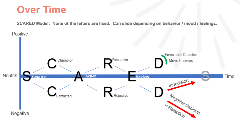 In the SCARED model, during a change process, the goal is to break out of the fear of change with a favourable decision point. If one cannot, then they may repress themselves back into the SCARED cycle until they can. If they remain inside this cycle it could be due to indecision or absence of information.