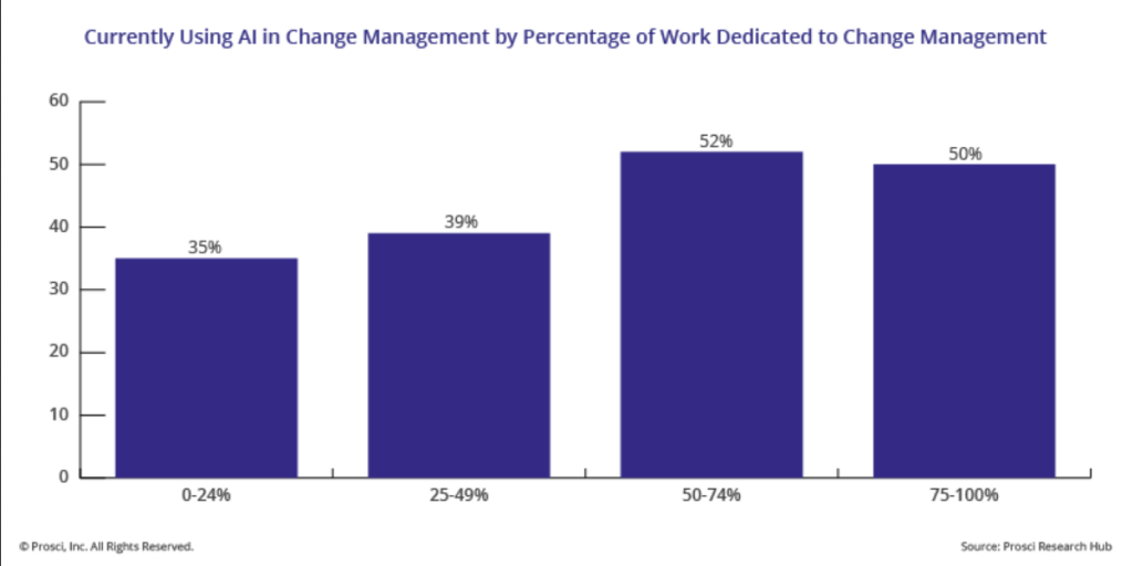 A recent study by Prosci shows that professionals with 5+ years’ experience whose work is primarily change management use AI for 50% or more of their work: