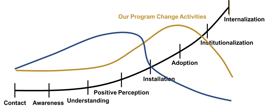 Traditionally, Conner’s Commitment Curve shows that installation of the change (or system) is at the center of the change curve for individuals.